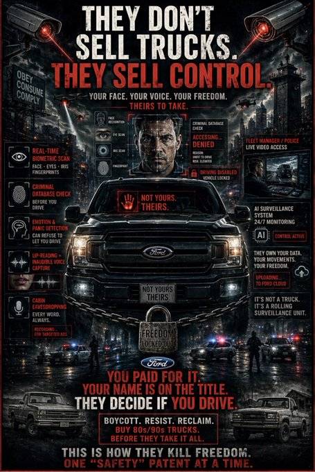 FORD JUST PATENTED THE END OF YOUR FREEDOM TO DRIVE YOUR OWN TRUCK. 😱 They didn’t just add “safety features.” They filed a STACK of patents for cameras, sensors, biometrics, and AI that: •Scan your face, eyes, iris, and fingerprints in real time •Run you through criminal databases BEFORE you even shift out of park •Detect “panic” or “emotion” and REFUSE to let you drive (emergency? Chainsaw accident on the ranch? Tough luck, truck stays in park) •Lip-read you with cameras + inaudible sound waves •Eavesdrop on every conversation in the cab for targeted ads •Let fleet managers (or cops) pull live video of you driving It’s not your truck anymore. They won. You paid for it. Your name’s on the title. But Ford owns your data, your movements, your face, and now the right to decide if you’re “fit” to leave your driveway. This isn’t sci-fi. It’s already patented. It’s already rolling out. And every other carmaker is racing to do the same. They turned your vehicle into a rolling surveillance cop car that snitches on you, and can physically STOP you from driving when you need it most. Boycott every company doing this. Buy 80s/90s trucks and never look back. This is how they kill personal freedom, one “safety” patent at a time. Ford & every traitor company behind this can go straight to hell.