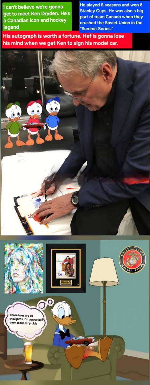 Oh boy, Mom really surprised us. She told us she was taking us to the great nation of Canada to meet Ken Dryden at an autograph signing fan appreciation event. Everyone knows Ken Dryden is a true ambassador of Canada. We came to learn about Ken Dryden through our good neighbor Hef. Hef would play us videos of the Montreal Canadiens destroying the Boston Bruins and New York Rangers. Hef has a picture of Dryden on his wall right next to Stevie Nicks. We knew we had to do something special for Hef. So after Hef passed out from the whiskey, we grabbed one of his model cars for Dryden to sign. Our trip to Canada was incredible; the people are so nice, polite, informed, and intelligent. We didn't want to come back home, but we just had to see the look on Hef's face when he saw his model car signed by his hero, Ken Dryden...🍁 To quote Bret Hart, another great Canadian, Dryden is... "The Best There Is, the Best There Was, the Best There Ever Will Be." Ken Dryden Aug. 8th 1947 - Sept. 5th 2025 RIP 🇨🇦❤️🏒🙏