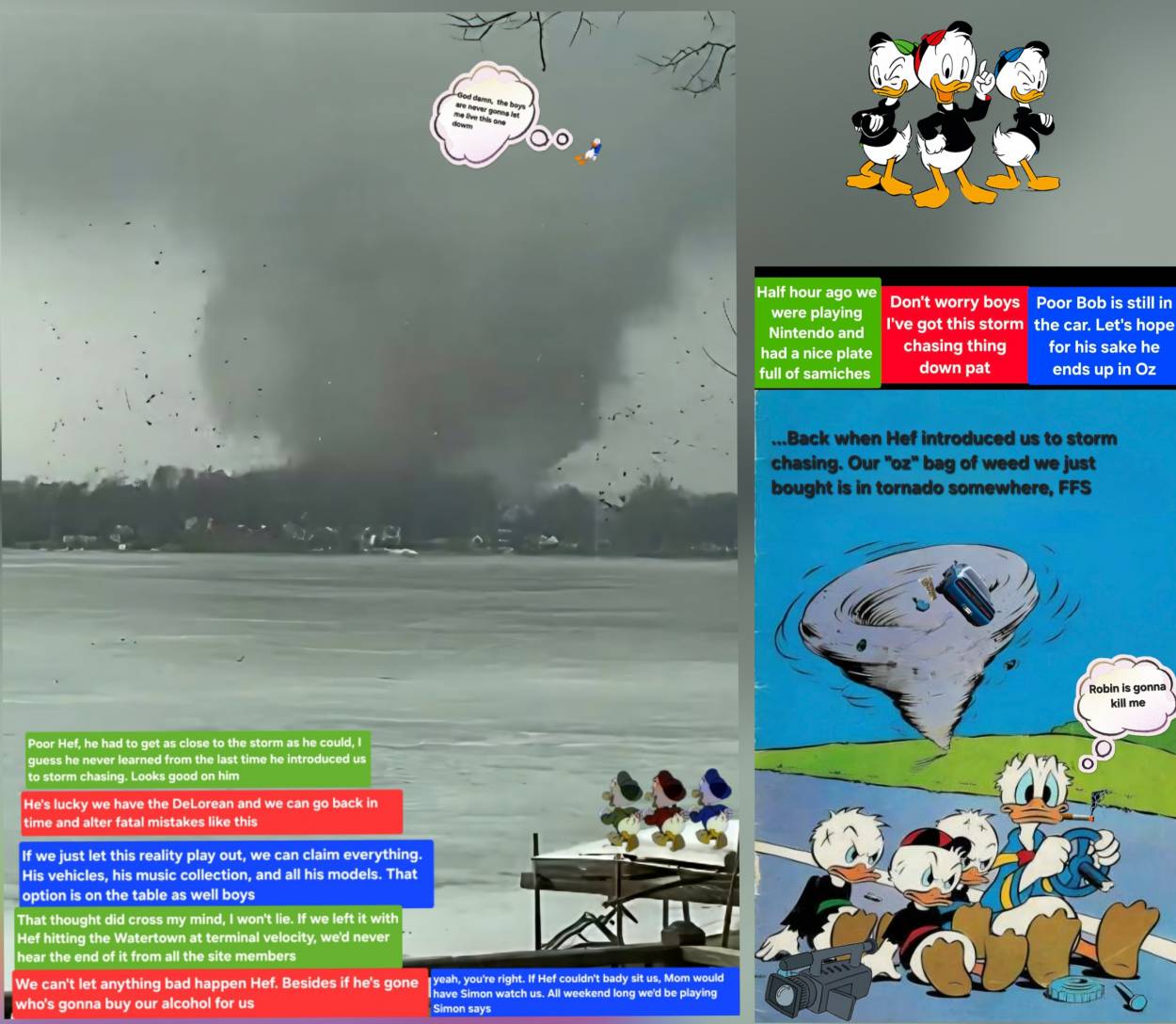 Well, another weekend is here. Mom is working at the hospital, so we're going to be staying with our good neighbor, Hef, again. We had our weekend all planned perfectly. We had a nice list of movie titles we were going to stream. We just picked up some new video games we were going to play on our Nintendo system. The plan was to stay up until the wee hours of the morning, just chilling, drinking our alcohol, and smoking our weed. Hef had another idea: he wanted to go to Union City, MI. He's always been fascinated with storm chasing. After our last and first experience with Hef storm chasing, we were very leery about the whole thing. Hef assured us it wouldn't be like the last time. He said we could be in Union City in no time, with the DeLorean. We looked at each other and reluctantly agreed to take him. He insisted we take him to ground zero. We strongly advised against that, but there's no reasoning with Hef when he thinks he's right. Against our better judgment, we dropped Hef at ground zero. We thought differently; we took up a position across the lake from the eye of the storm. We knew Mother Nature's wrath was unforgiving. When the storm grew stronger, all we could do was watch in horror. One moment Hef was there, the next he was consumed by the storm. What a cautionary tale, Mother Nature plus gravity is an unbeatable force. When I saw Hef taking that final ride, all I could think of was, when the weight comes down...