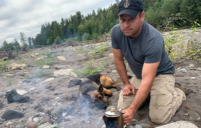 Master Sgt. Earl Plumlee makes coffee from a river with his dog Pepper. (Photo Courtesy of Plumlee Family)