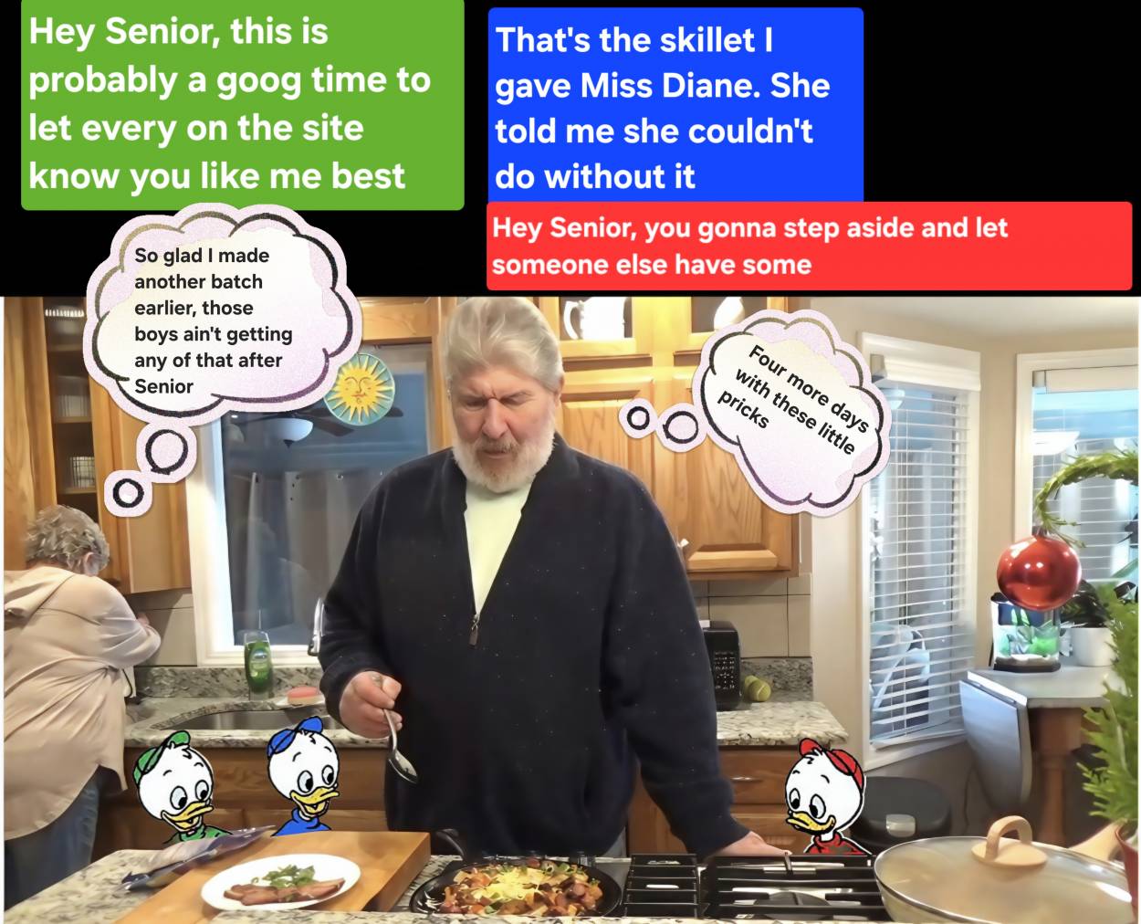 It was so good of Mom and Diane to arrange a nice visit at the new house just before Christmas. Diane was worried about having everything just so for the first Christmas in the new house. So it's a good thing we're here for a week's stay. We can see to all the little things that need to be done, and we'll be able to keep Senior focused and on point with everything that needs doing. Diane gets some piece of mind, we'll help Senior roast a few phonies, it's truly a double bonus for both of them. We just feel so at home here, Senior and Diane don't exception with the loud music, the drinking, and us smoking in the house. Mom is so proud of us for always stepping up and helping when needed...