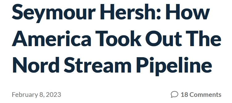 The Reese Report has a good but short overview of the Seymour Hersh story about how the US took out the Nord Stream pipeline. The Hersh story is a good read but fairly long, harkening back to Operation Ivy Bells, speculating on what jobs Navy Annapolis grads do and do not want to take in the Navy along with lots of other chatter.