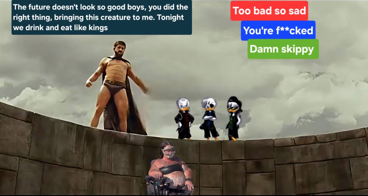 Miss Diane being upset isn't an option. We had to make this right. We abducted this bitch while she was cashing one of her benefit checks. The DeLorean made a little trip back to ancient Sparta. Leonidas was very happy to see us again. He took one look at this creature and knew exactly what needed to be done with her, into the body pit she went. He was very grateful for the offering we brought him. He repaid us very nicely. The food, the drink, and the women, Hef's gonna be sorry he missed this trip...