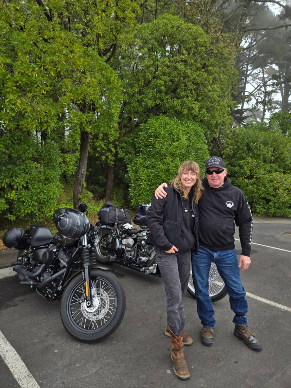 My younger brother rode to the west coast from chicago to visit his daughter. They took a ride up the coast together. He's gonna swing by my place for an oil change on his way back. On his hat, "dirty hands clean money"