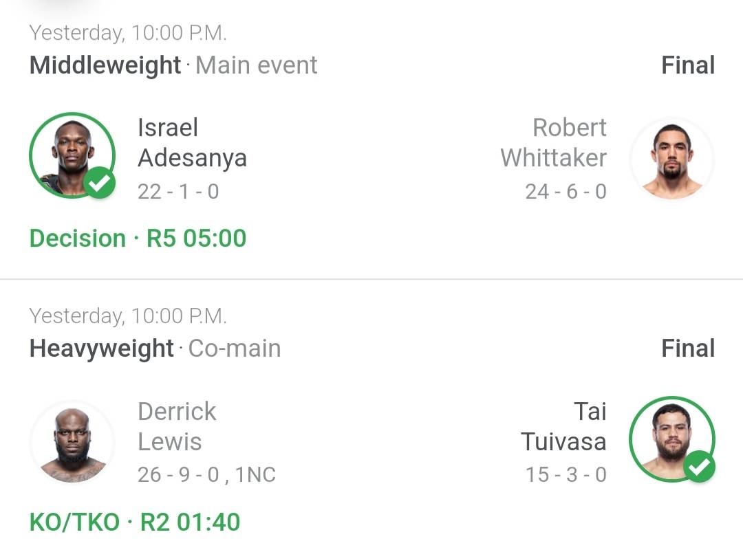Hey Jai, here's your results from UFC 272 !! ๐ Israel adesanya the New Zealander beat Robert Whittaker the Aussie. Derrick Lewis got knocked the f*** out by the Aussie Tai Tuivasa !!