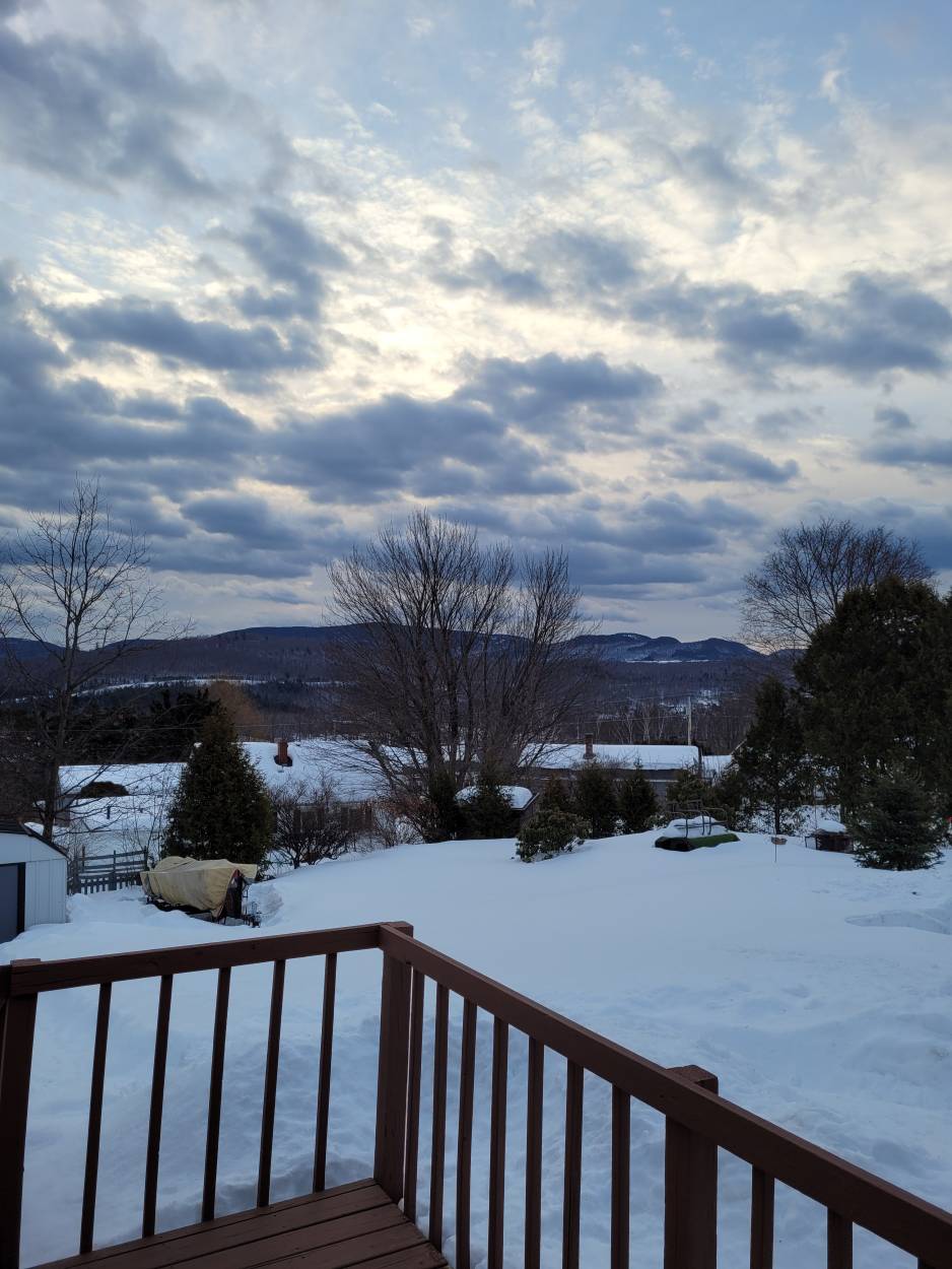 Good morning from the white mountains. You can see the presidential range but they're in the clouds now, this is a little left towards the Mahoosuc range eastward from ma and dads deck. Cloudy 48F