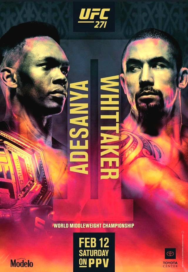 Looking for something to watch tonight ?? Once again Uncle Dana and the UFC are leading the way in combat sports.Tonight live from the Toyota Center in Houston, Texas, UFC 271. Robert Whittaker vs. Israel Adesanya II, for the UFC middleweight title. Preliminary card starts at 8PM EST and will be shown on ESPN. The Main card starts at 10PM EST and will be on pay-per-view. Enjoy the fights or whatever it is you folks have planned for tonight.